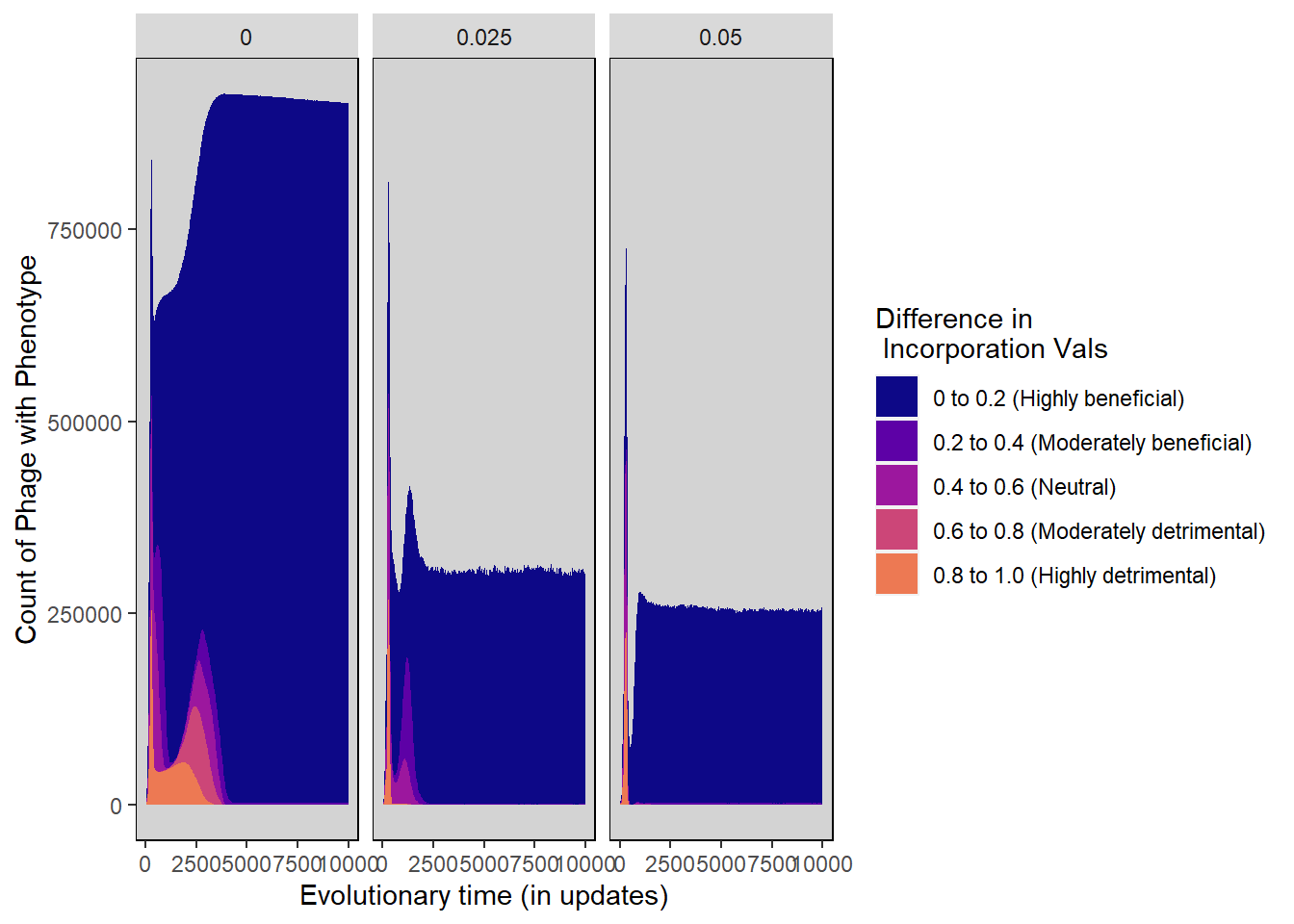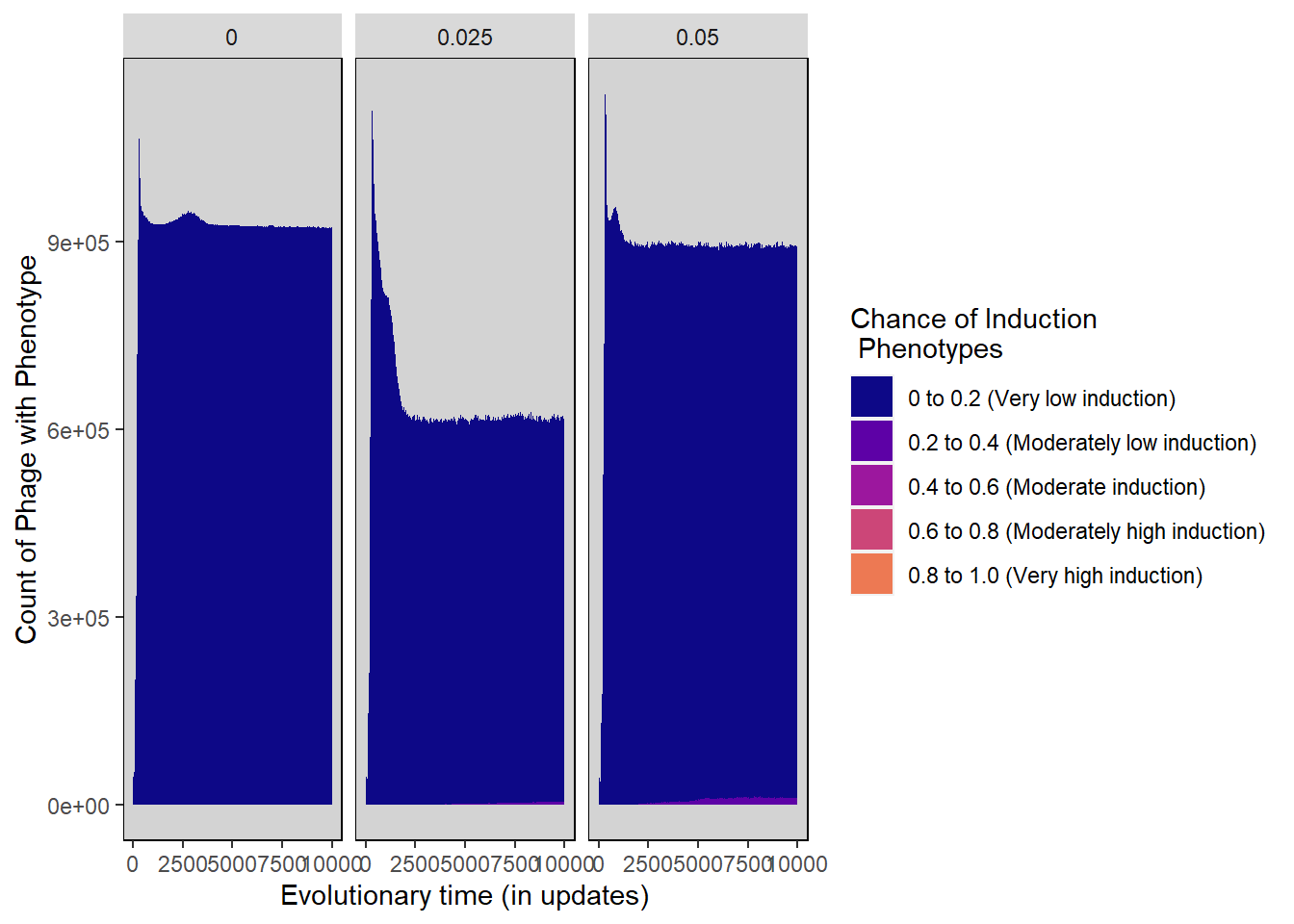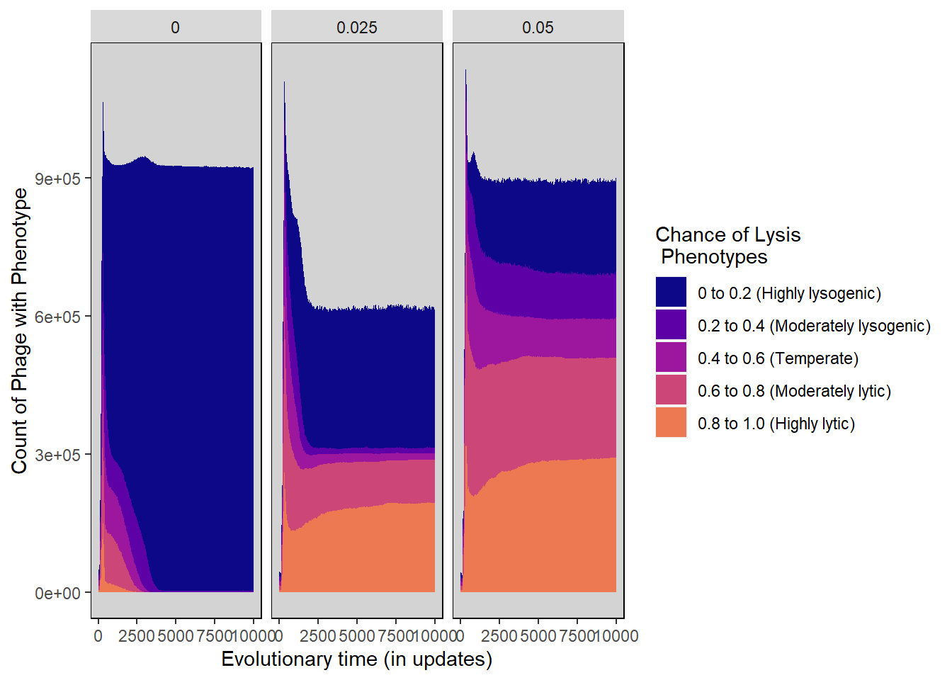 ylab("Count of Phage with Phenotype") + xlab("Evolutionary time (in updates)") +