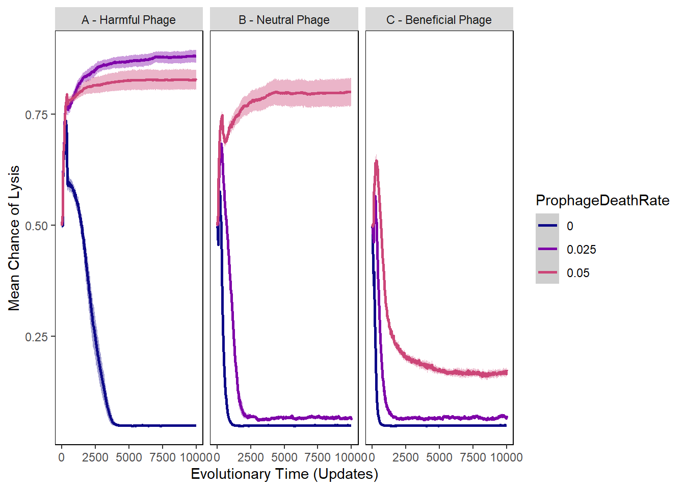 ylab("Mean Chance of Lysis") + xlab("Evolutionary Time (Updates)") +