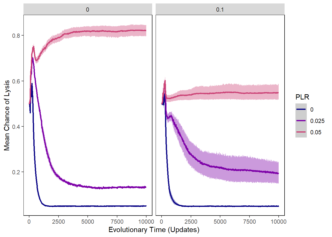 ylab("Mean Chance of Lysis") + xlab("Evolutionary Time (Updates)") +