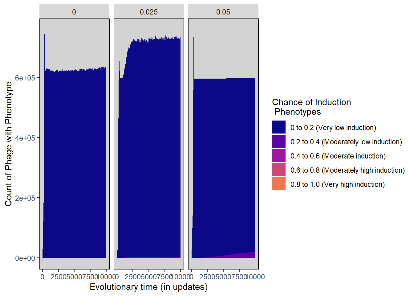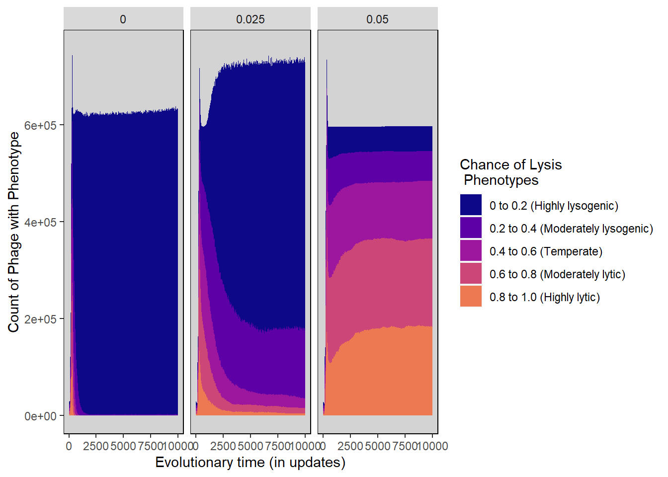 ylab("Count of Phage with Phenotype") + xlab("Evolutionary time (in updates)") +